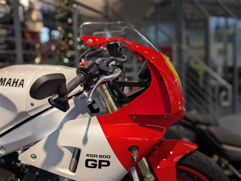 Optisch ist die Yamaha XSR 900 GP ein echter Hingucker. Das auffällige, kantige Verkleidungsdesign erinnert sofort an die ikonischen YZR500-Modelle der 80er und 90er Jahre. Die Lackierung in rot-weiß-gelb unterstreicht diesen Eindruck und zieht die Blicke magisch an. Die Frontverkleidung mit Scheibe, der aerodynamische Heckbürzel und die klaren Linien vermitteln echtes Racing-Feeling.