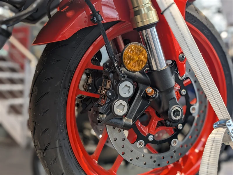 Vorne gibt es radial verschraubte 4-Kolben Festsätteln von Advics auf 298 mm Doppelscheiben sowie eine Brembo-Radialbremspumpe. Die Bremse könnte für unseren Geschmack allerdings etwas mehr Biss vertragen. Für normale Brems-Manöver ist natürlich alles okay, um aber sehr stark zu verzögern, muss man schon ein wenig Kraftaufwand betrreiben. Das ist merkwürdig, weil sich dies bei der XSR 900 anders angefühlt hat, obwohl sie eigentlich über die gleiche Bremsanlage verfügt.