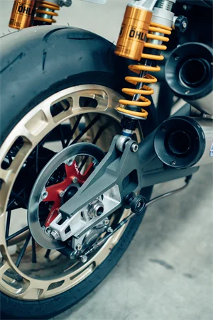 Die Gabelbrücken sind Replikas der 750er Bol d'Or-Brücken, die an die 43-mm-Öhlins-Gabel angepasst wurden. Das Heckteil wurde für die Verwendung von zwei Öhlins Doppelfederbeinen modifiziert, kombiniert mit einer eigens angefertigten Schwinge aus 7020 Aluminiumrohren.