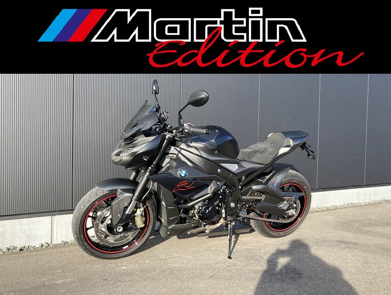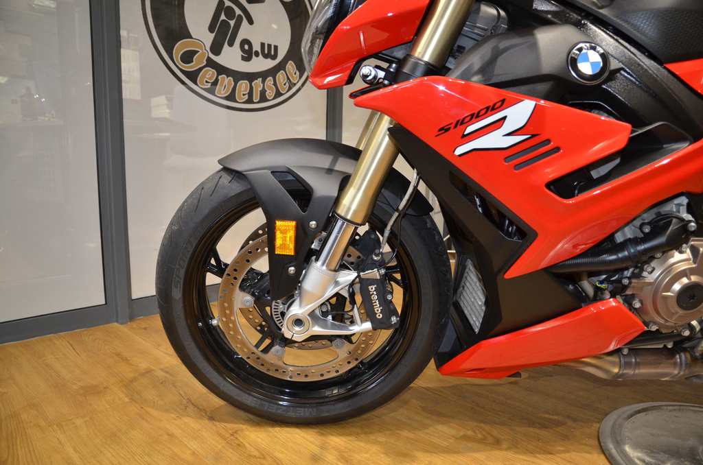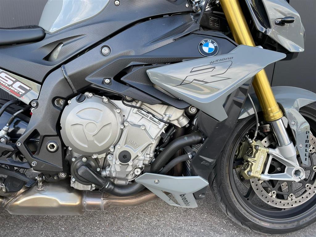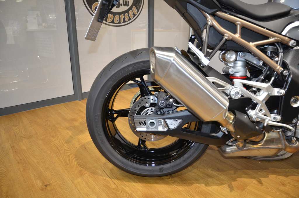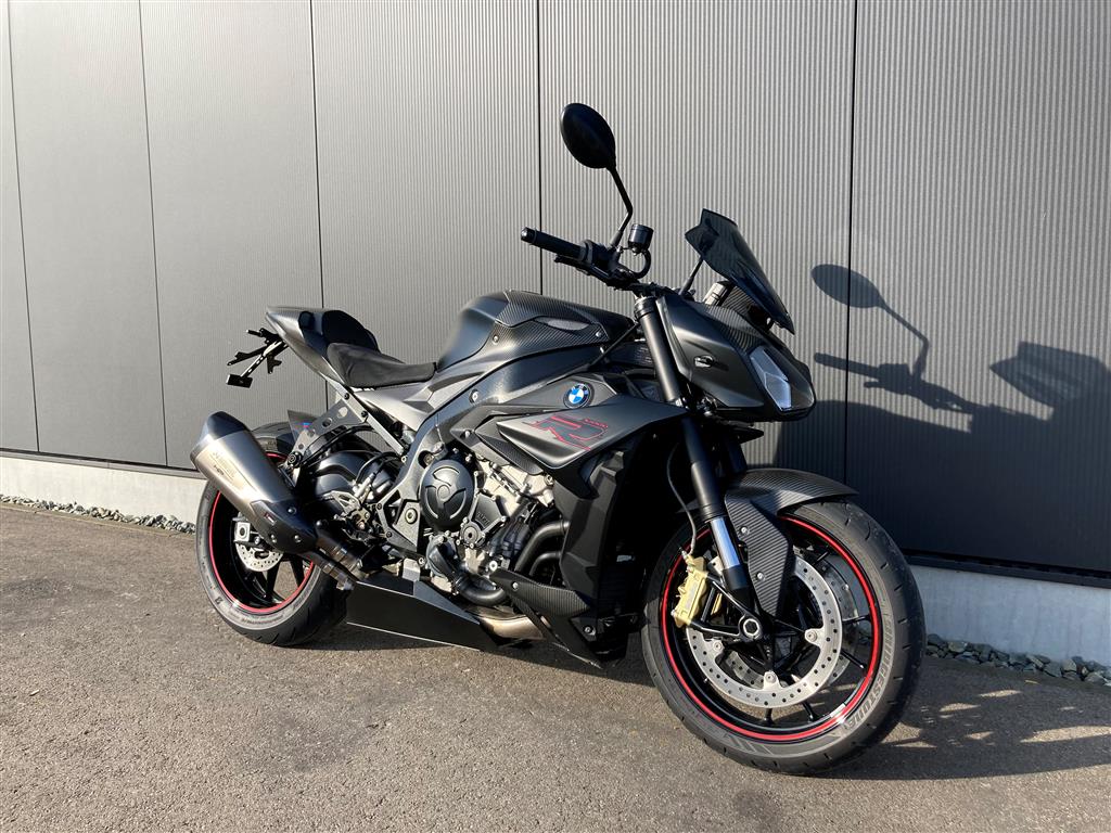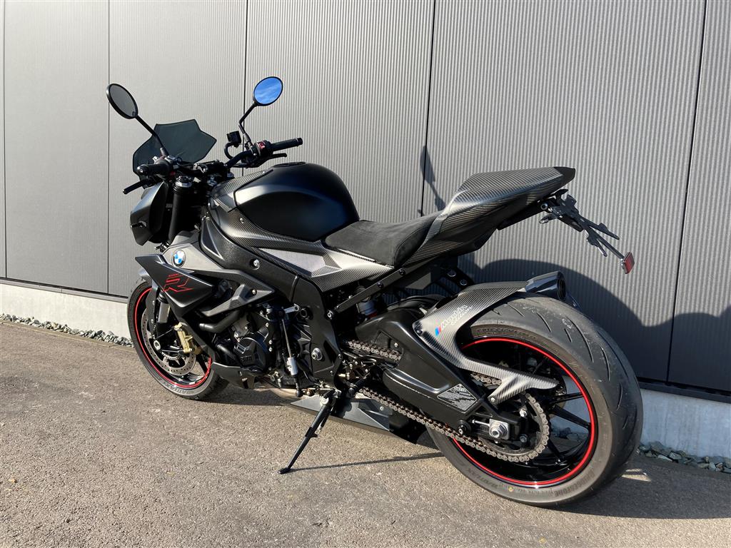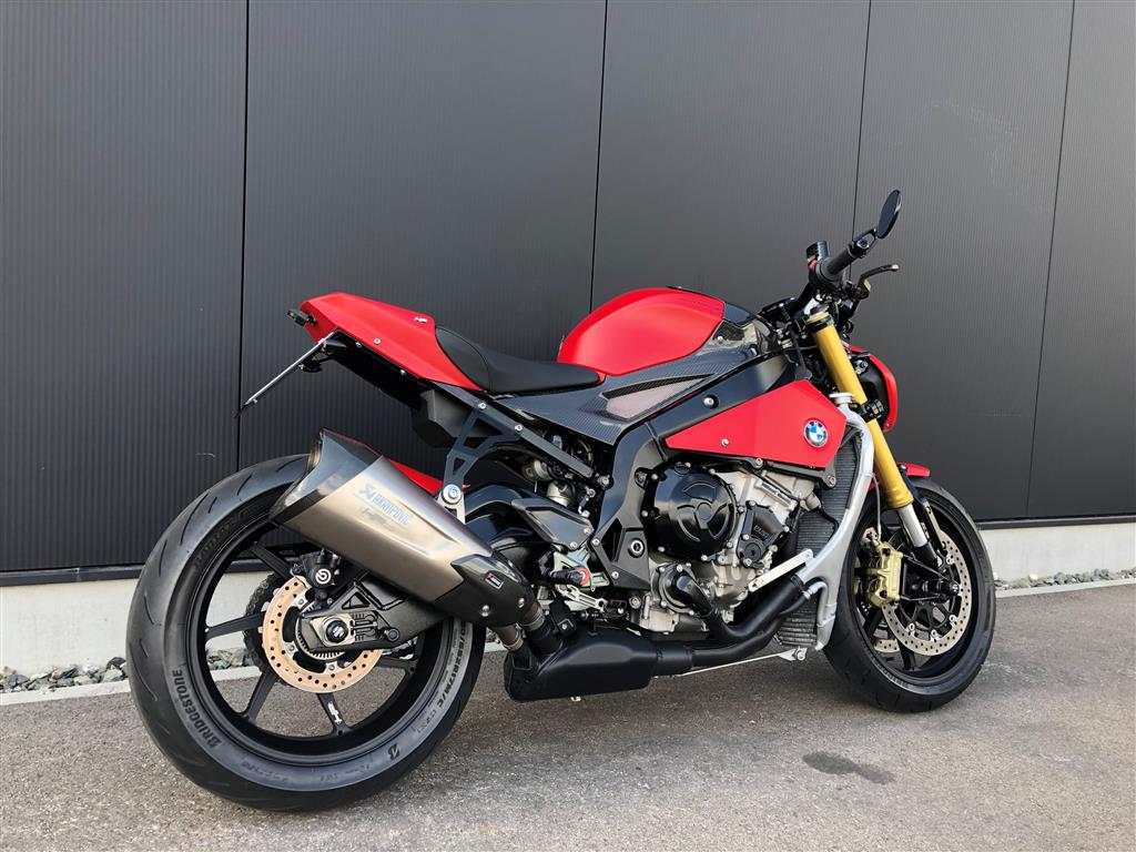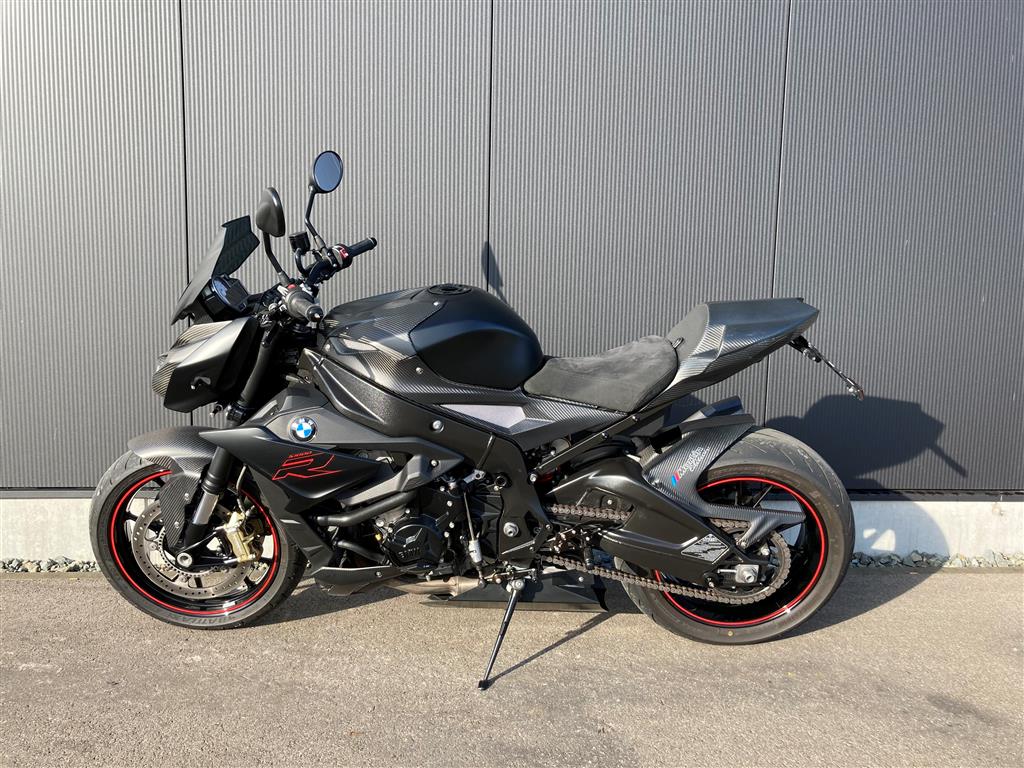 Da steht sie. Man erkennt das neue Modell auf Anhieb an der neuen Lampenmaske, alle Leuchten strahlen nun mit LED-Technik. Die gedrungene und gestreckte Optik wurde beibehalten, man ahnt schon allein beim Anblick, dass hier gleich die Post abgeht. Es gibt die S1000R in drei Farbvarianten, wobei die schicke weiß-blau-rote Version im "M-Paket" auch gleich noch Schmiederäder, Akrapovic-Sportschalldämpfer, Sportsitz und die empfehlenswerte weil pflegeleichte Endurance-Kette mitbringt - für einen Aufpreis von 2.800 Euro! Wer Carbonräder ordert, legt nochmal 2.100 Euro drauf - puh!