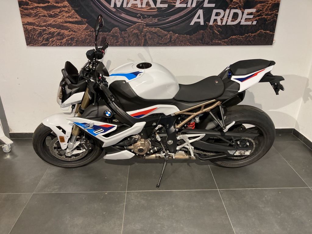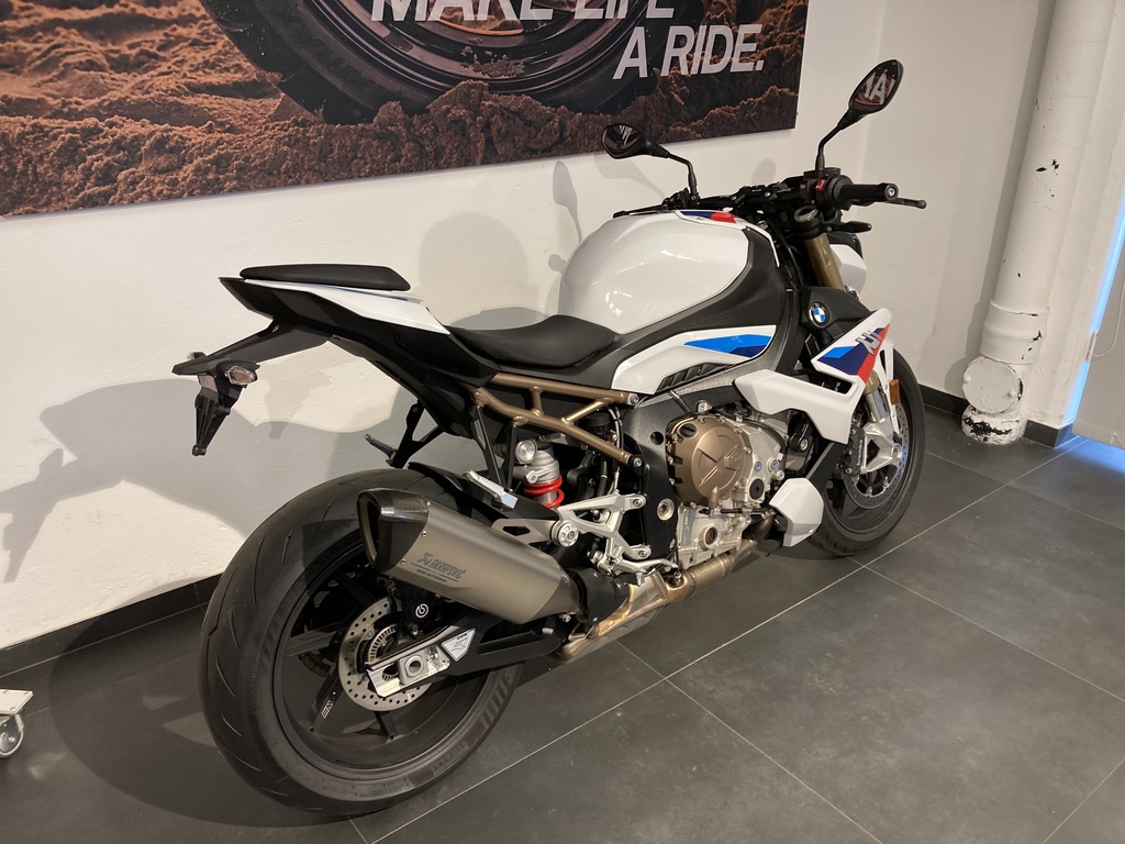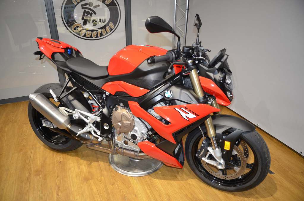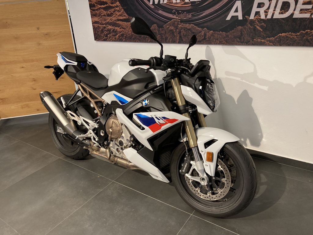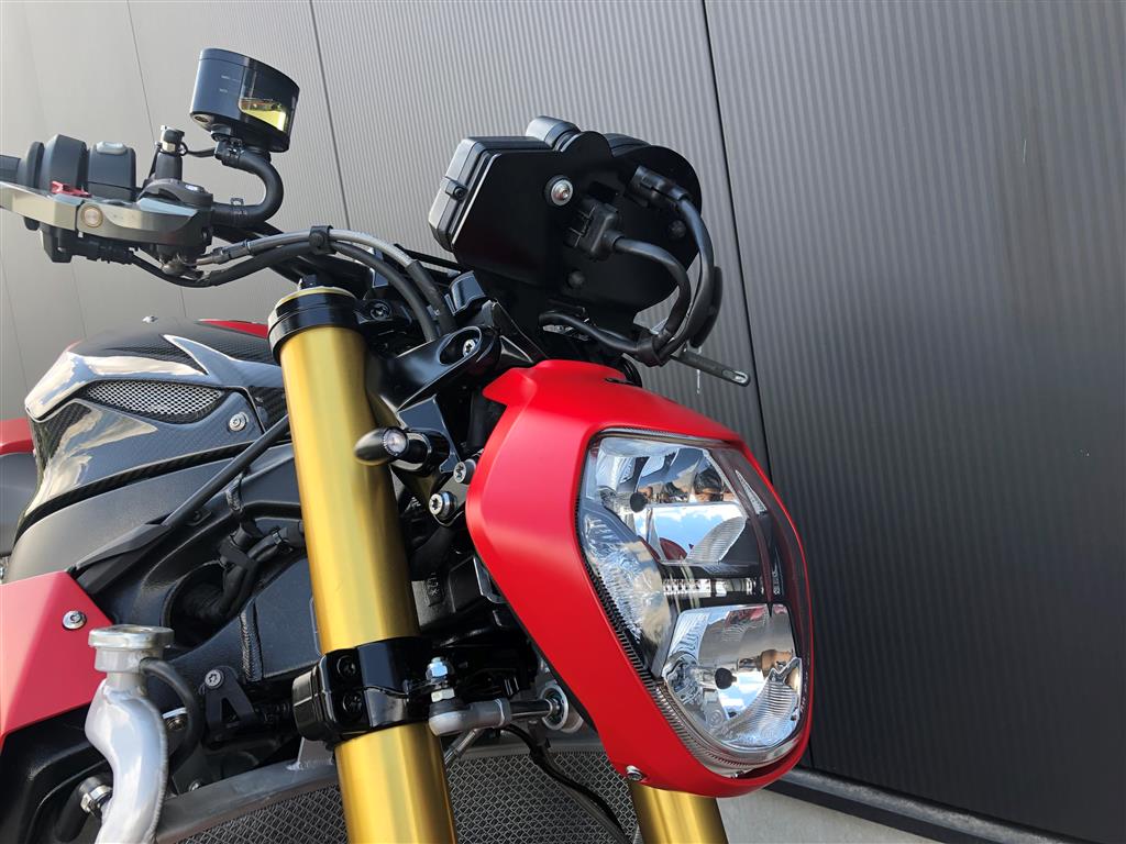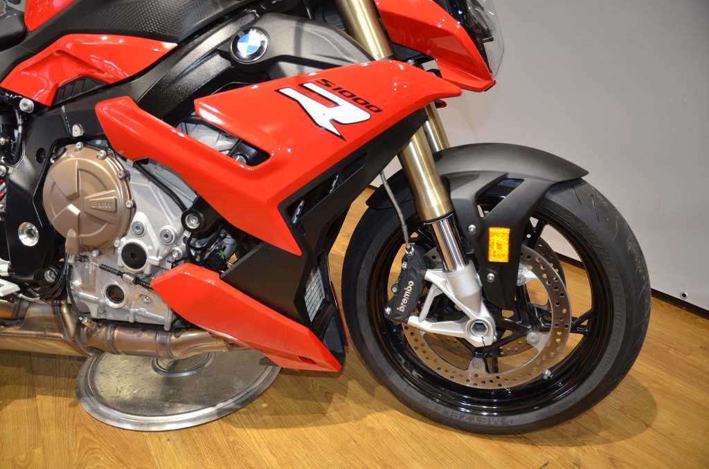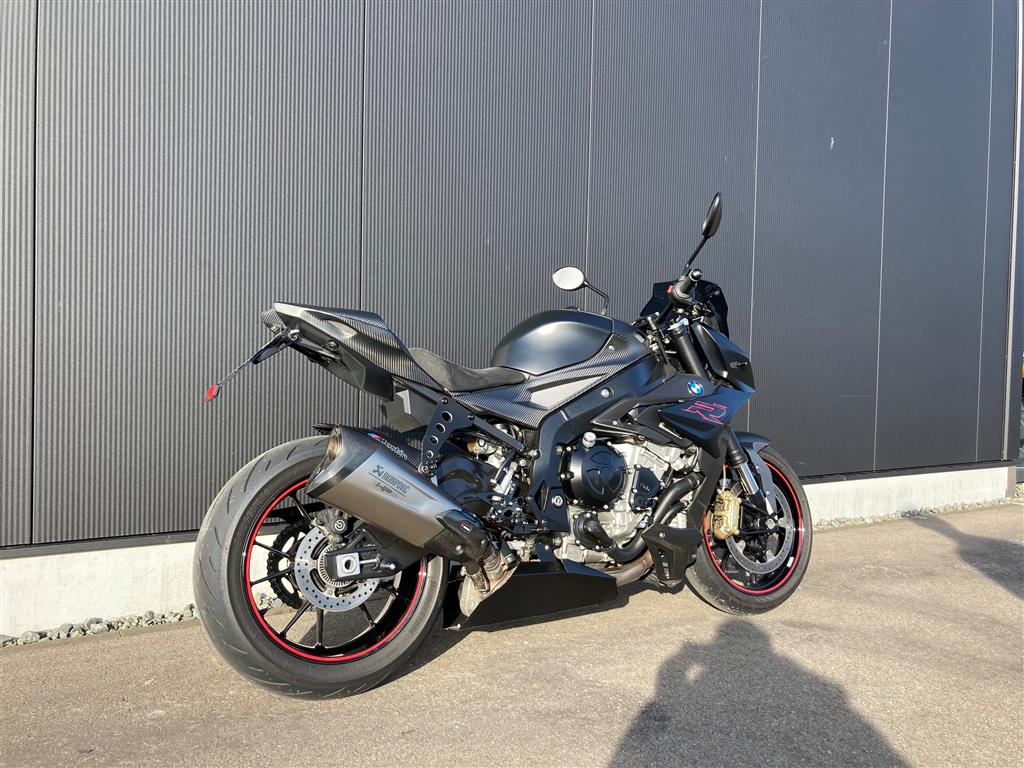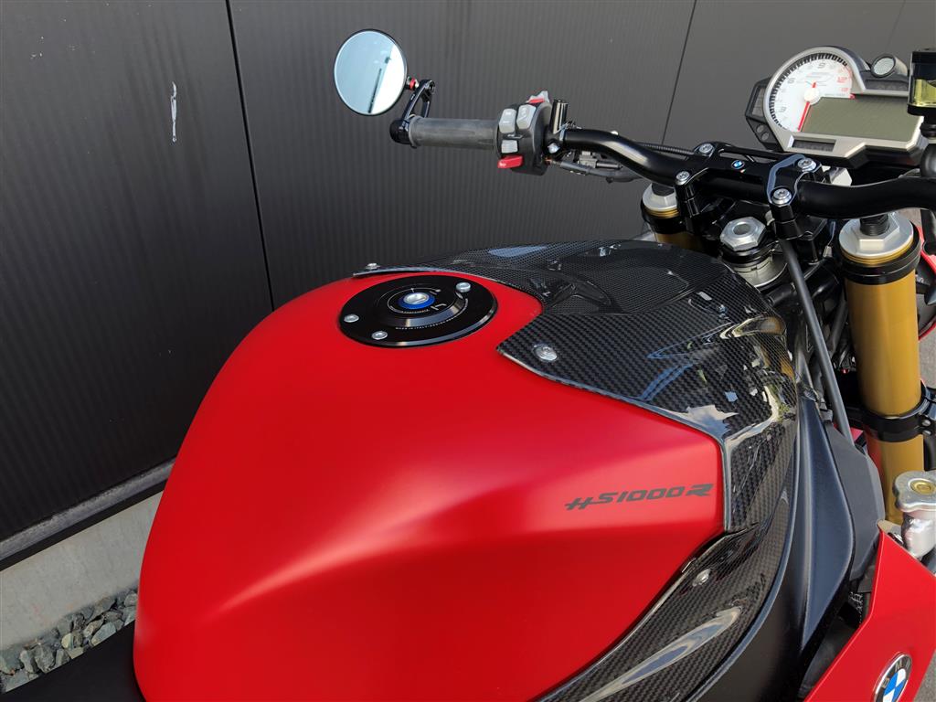 Da steht sie. Man erkennt das neue Modell auf Anhieb an der neuen Lampenmaske, alle Leuchten strahlen nun mit LED-Technik. Die gedrungene und gestreckte Optik wurde beibehalten, man ahnt schon allein beim Anblick, dass hier gleich die Post abgeht. Es gibt die S1000R in drei Farbvarianten, wobei die schicke weiß-blau-rote Version im "M-Paket" auch gleich noch Schmiederäder, Akrapovic-Sportschalldämpfer, Sportsitz und die empfehlenswerte weil pflegeleichte Endurance-Kette mitbringt - für einen Aufpreis von 2.800 Euro! Wer Carbonräder ordert, legt nochmal 2.100 Euro drauf - puh!