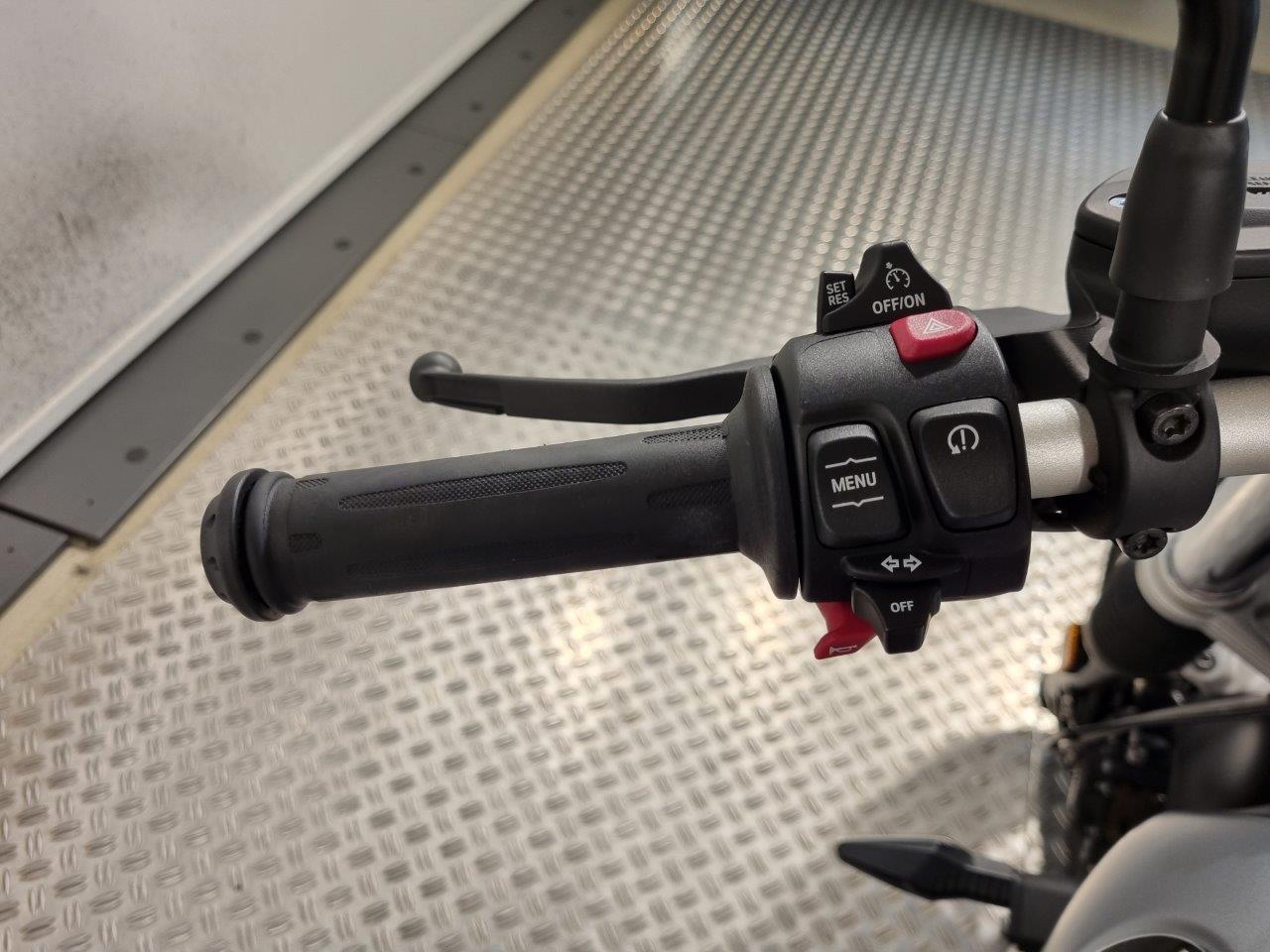 Beim Starten schüttelt sich das klassische Triebwerk kurz, stärker als die modernen Versionen. Dass der Motor läuft, hört man an der Auspuffanlage vom Spezialisten Akrapovic. Sehen in Form eines Drehzahlmessers tut man es nicht, denn ebenso wie eine Gang- oder Tankanzeigeanzeige fehlt diese Info komplett. Immerhin sieht es gut aus, das sehr pur und rein erscheinende Kombiinstrument.